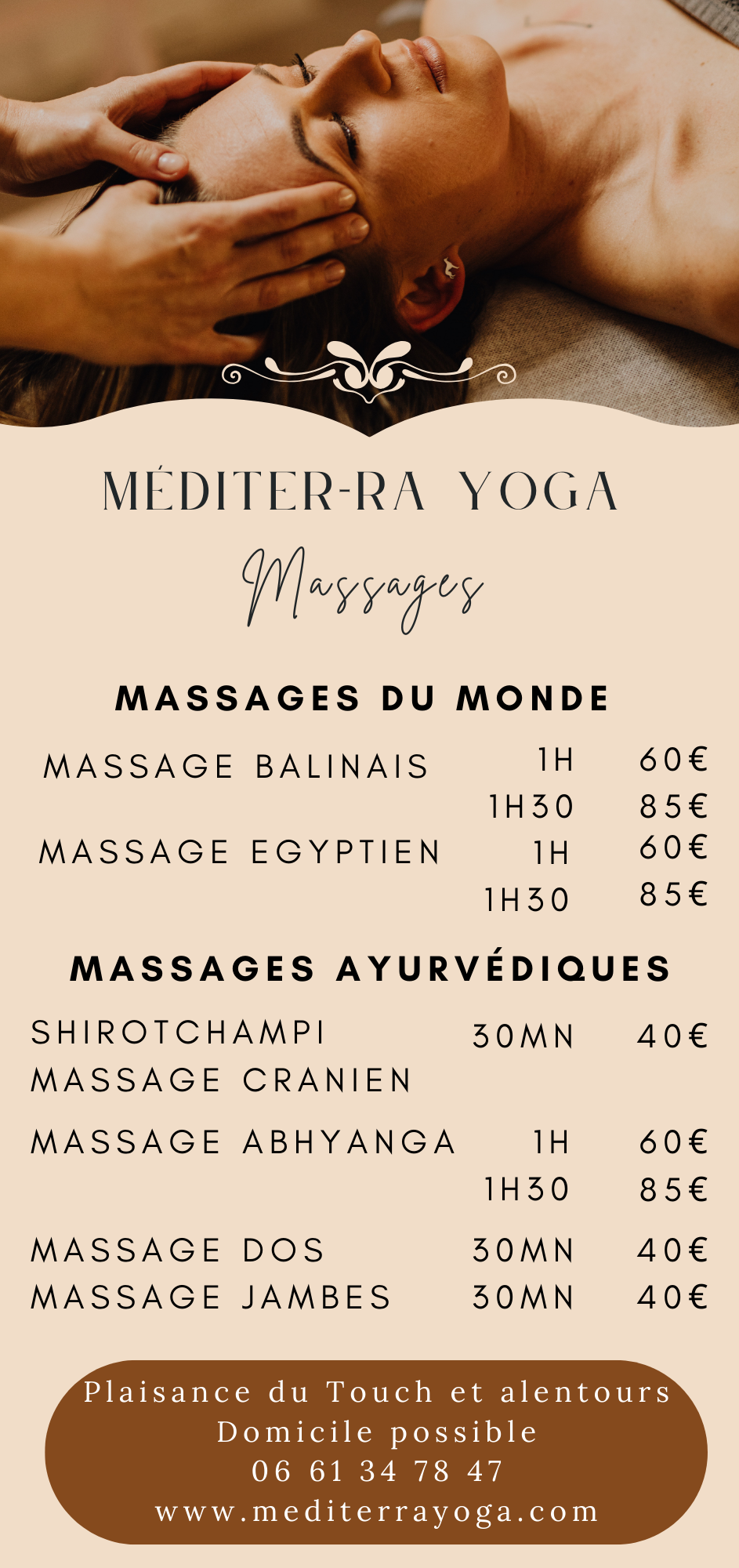 Massages Balinais, Abhyanga, Egyptien à domicile, sur le lieu de travail ou au cabinet