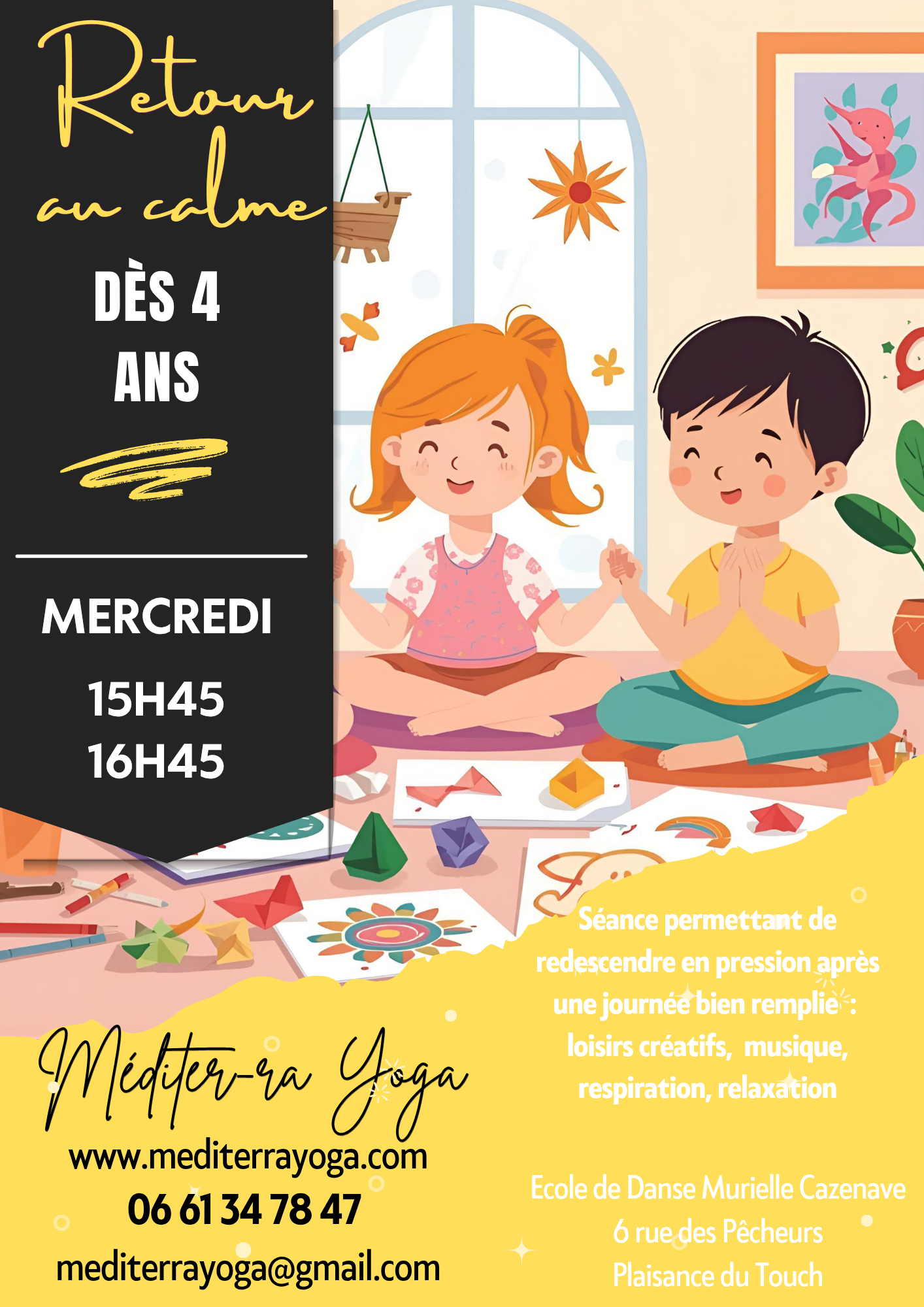 S'inspirant des techniques yogiques, de relaxation, de respiration et de loisirs créatifs, la séance permettra à votre enfant de redescendre en pression après une journée bien remplie.